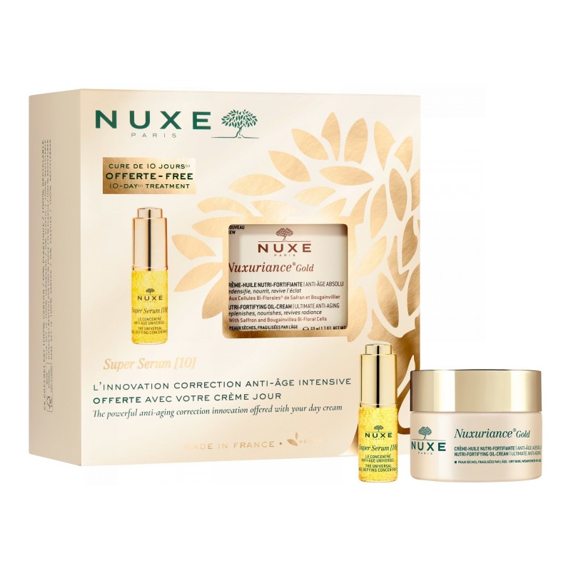 NUXE asocia el poder regenerador de las Células Bi-florales de Azafrán y Buganvilla, el Oléoactif® de Rosa de Porcelana y un poderoso complejo nutri-reconsitituyente para relipidar, reforzar y reavivar la luminosidad de las pieles fragilizadas por la edad.Esta Crema-Aceite infusionada de Micro-Reflectores dorados, colma la piel de nutrición y vitalidad y la sublima instantáneamente. Desde la primera aplicación, la piel se ilumina. Plenamente nutrida, recupera el confort, la elasticidad y la suavidad. Día tras día, la piel se fortalece: se vuelve más densa y más firme. Las arrugas se alisan, la piel se redensifica intensamente. Como revitalizada, rebosa salud. Se ve más bella, llena de vida.Principios activos de origen natural: Células Bi-Florales® de Azafrán y Buganvilla, Oléoactif® de Rosa de Porcelana, Complejo natural Nutrirreconstituyente (Jiogulan y Flores de Cistus), Aceite de Macadamia.DE REGALO: 10 días de tratamiento Super Serum[10]INGREDIENTESNuxuriance® Gold Crema-Aceite Nutri-fortificante: AQUA/WATER, SQUALANE, GLYCERIN, COCO-CAPRYLATE/CAPRATE, BEHENYL ALCOHOL, MACADAMIA INTEGRIFOLIA SEED OIL, ARACHIDYL ALCOHOL, DIMETHICONE, CETEARYL ALCOHOL, HYDROGENATED COCONUT OIL, PARFUM/FRAGRANCE, TOCOPHEROL, ARACHIDYL GLUCOSIDE, MICA, ACRYLATES/C10-30 ALKYL ACRYLATE CROSSPOLYMER, PHENOXYETHANOL, ETHYLHEXYLGLYCERIN, SODIUM STEAROYL GLUTAMATE, DEHYDROACETIC ACID, CAPRYLOYL GLYCINE, SODIUM GLUCONATE, SODIUM HYDROXIDE, XANTHAN GUM, CITRIC ACID, HYALURONIC ACID, BOUGAINVILLEA GLABRA LEAF CELL EXTRACT, DECYL GLUCOSIDE, GLUTAMINE, PHENETHYL ALCOHOL, BRASSICA CAMPESTRIS (RAPESEED) SEED OIL, CI 77491/IRON OXIDES, SOLANUM LYCOPERSICUM (TOMATO) FRUIT EXTRACT, CISTUS INCANUS FLOWER/LEAF/STEM EXTRACT, GYNOSTEMMA PENTAPHYLLUM LEAF/STEM EXTRACT, ETLINGERA ELATIOR EXTRACT, SIMMONDSIA CHINENSIS (JOJOBA) SEED OIL, CROCUS SATIVUS FLOWER EXTRACT, EICHHORNIA CRASSIPES EXTRACT, BENZYL ALCOHOL, BENZYL SALICYLATE, LINALOOL, COUMARIN, GERANIOL, CITRONELLOL [N4002/A].Super Serum [10]: AQUA/WATER, GLYCERIN, CAPRYLIC/CAPRIC TRIGLYCERIDE, BETAINE, PROPANEDIOL, NIACINAMIDE, PENTYLENE GLYCOL, 1,2-HEXANEDIOL, COCO-CAPRYLATE/CAPRATE, CASTOR* OIL/IPDI COPOLYMER, LEONTOPODIUM ALPINUM CALLUS CULTURE EXTRACT, CARBOMER, CAPRYLYL GLYCOL, PARFUM/FRAGRANCE, CITRIC ACID, SODIUM HYDROXIDE, HYALURONIC ACID, TRISODIUM ETHYLENEDIAMINE DISUCCINATE, SODIUM HYALURONATE, PASSIFLORA INCARNATA EXTRACT, ALCALIGENES POLYSACCHARIDES, BENZYL ALCOHOL, XANTHAN GUM, DEHYDROACETIC ACID [N4601/A]. * Dérivé d’huile de ricin.