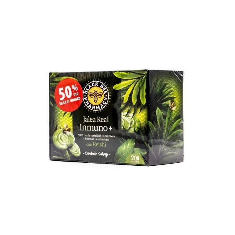 Black Bee Jalea Real Inmuno+ es un complemento alimenticio que combina las propiedades de la Jalea Real, el Própolis, el Reishi. Equinácea y 4 Vitaminas para ayudar a las defensas naturales del organismo.MODO DE EMPLEOTomar 1 vial de 10 ml/día, directamente o disuelto en un vaso de agua o zumo, preferiblemente en aynas. Agitar antes de usar. No superar esta dosis.Fructosa, agua, jalea real, extracto seco de acerola ( Malpighia glabra L, frutos, ácido L-ascórbico), extracto seco de equinácea (Echinacea purpurea L, Moench, herba), zumo de limón deshidratado, extracto seco de reishi (Granoderma lucidum ( Leyss. Ext. Fr.) Karst, carpoforos), extracto fluido de eucalipto ( Eucalyptus globulus labill, hojas), conservador: sorbato potásico, aroma natural, extracto seco de própolis, colecalciferol, clorhidrato de piridoxina y riboflavina. Por 1 vial 10ml: Jalea Real: 2000 mg Es* de Acerola: 160 mg Es* Equinacea: 125 mg Es* Reishi: 50 mg Extracto fluido de Eucalito: 25 mg Es* Própolis: 10 mg Vitamina D: 5 mcg Vitamina C: 40 mg Vitamina B2( Riboflavina): 1,4 mg Vitamina B6: 1,4 mg* Extracto seco.Los complementos alimenticios no deben utilizarse como sustitutos de una alimentación variada y equilibrada y un modo de vida sano. No superar la dosis diaria expresamente recomendada. Mantener fuera del alcance de los niños más pequeños.Conservar en lugar fresco y seco, protegido de la luz.