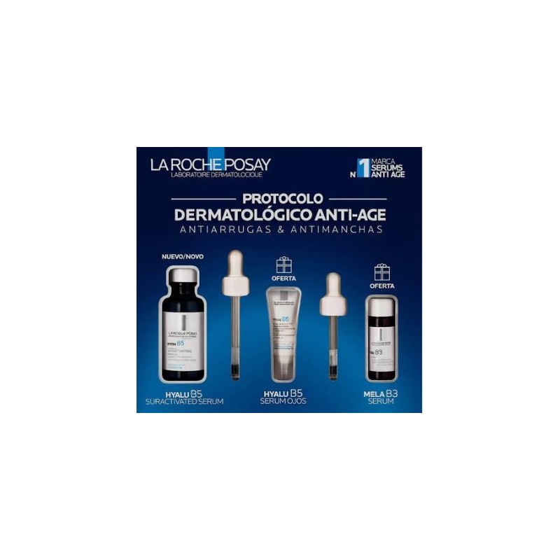 Beneficios: la roche posay protocolo antiedad hyalu b5 combina acido hialuronico de 4 pesos moleculares, vitamina b5 y madecasosido para hidratar, rellenar y mejorar la elasticidad de la piel. Ademas, este cofre incluye de regalo el hyalu b5 ojos 5 ml y el sérum mela b3 10 ml para completar la rutina antiedad e iluminadora. Ideal para pieles deshidratadas o con primeras arrugas que buscan un tratamiento antiedad e hidratante, apto incluso para piel sensible.
