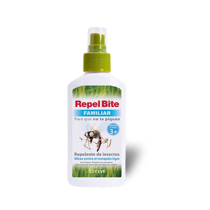 REPEL BITE, ES UN NUEVO REPELENTE DE INSECTOS SINTÉTICO EN SPRAY.SE TRATA DE UN PRODUCTO QUE OFRECE UNA ALTA TOLERABILIDAD Y EFICACIA, ESPECIALMENTE FRENTE A LOS MOSQUITOS TIGRE.SU PRINCIPIO ACTIVO (IR 3535 AL 20%) FORMA SOBRE LA PIEL UNA EFICAZ BARRERA PROTECTORA CON UN EFECTO DE LARGA DURACIÓN, DE ENTRE SEIS Y OCHO HORAS PARA TODO TIPO DE MOSQUITOS Y DE CINCO HORAS EN EL CASO DEL MOSQUITO TIGRE.REPEL BITE ESTÁ RECOMENDADO COMO REPELENTE DE INSECTOS EN ADULTOS Y EN NIÑOS MAYORES DE DOS AÑOS POR LA ORGANIZACIÓN MUNDIAL DE LA SALUD (OMS) Y POR EL CENTRO DE CONTROL Y PREVENCIÓN DE ENFERMEDADES DE LOS ESTADOS UNIDOS.NO MANCHA LA ROPA, ES INCOLORO Y TIENE UN AGRADABLE OLOR.