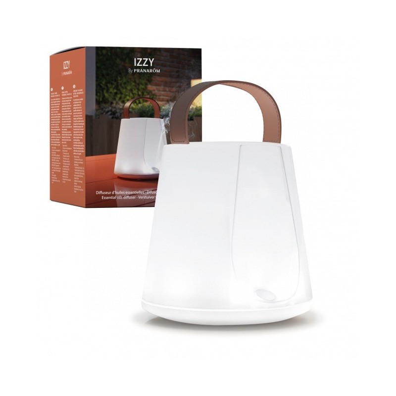 Izzy es un difusor inalámbrico con batería recargable. Puede llevarse fácilmente a todas partes: según te apetezca en cada momento, puedes ponerlo en un espacio interior, como un salón, un recibidor, un pasillo o un despacho, para crear una atmósfera relajante y de bienestar, o para purificar el aire. Igualmente, puede colocarse en el exterior, en el jardín, en la terraza o en un balcón, para disfrutar con toda serenidad de la belleza de cada día.Es muy fácil de utilizar y está listo para difundir en un momento : solo hay que enroscar directamenteun frasco de aceites esenciales sin retirar el cuentagotas... ¡y ya está!Si cambia de aceite esencial :Dar la vuelta al difusor para poner el frasco en posición vertical con la abertura hacia arriba. Retirar la cubierta y agitar durante un mínimo de 30 segundos (ver diagrama) para que todo el aceite esencial retorne al frasco. Es recomendable desenroscar el frasco de la base de forma rápida y sin interrupción, para evitar fugas de aceite esencial durante el cierre de la válvula de seguridad. Como medida de precaución en caso de manipulación incorrecta, se recomienda llevar a cabo esta operación sobre el fregadero u otra superficie protegida.Nota : es normal que queden algunos restos de aceite esencial en el cuentagotas o en la base. Se recomienda secarlos cuidadosamente con un paño absorbente.