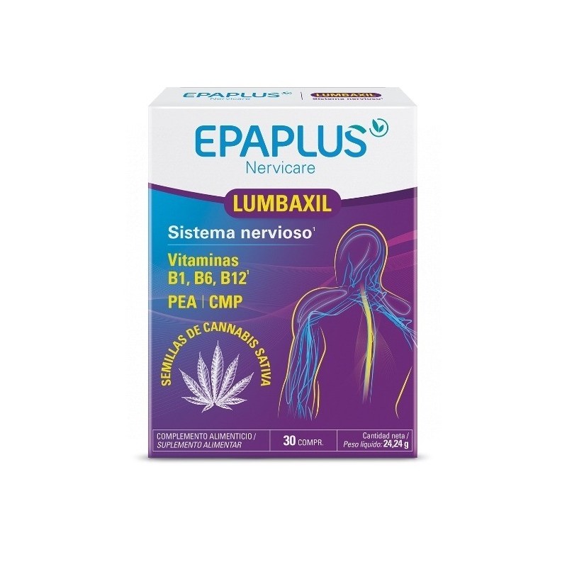 Epaplus Nervicare Lumbaxil es un complemento alimenticio que ayuda al funcionamiento normal del sistema nervioso por su contenido en vitaminas B1, B6 y B12. Además, contiene otros ingredientes como PEA (Palmitoiletanolamida), CMP (Citidina monofosfato) y aceite de semillas de Cannabis sativa.