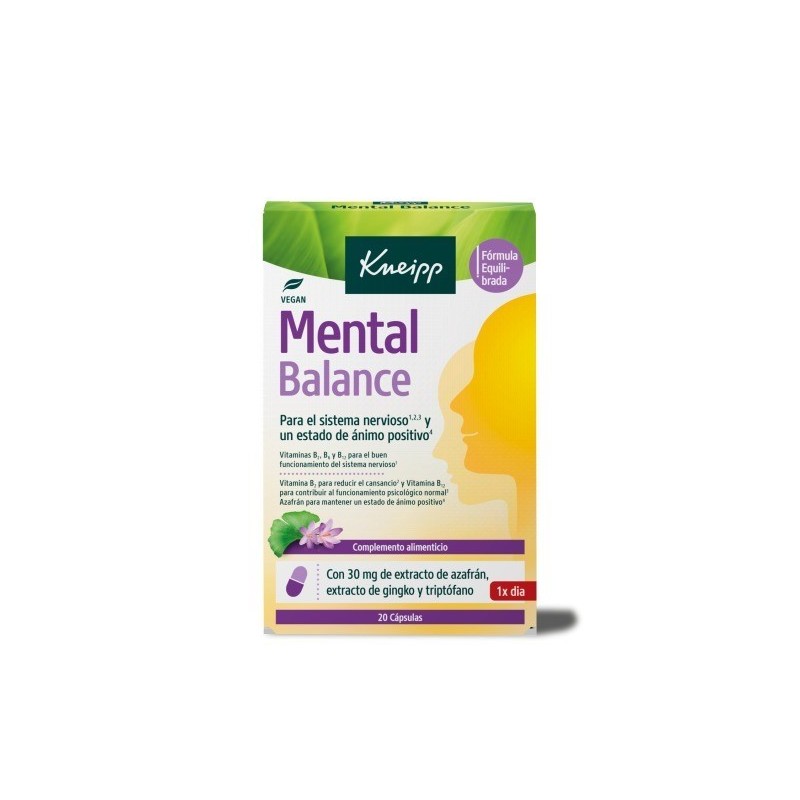 Vitaminas B2, B6 y B12 para el buen funcionamiento del sistema nervioso1.Con vitamina B2 para reducir el cansancio2 y vitamina B12 para contribuir al funcionamiento psicológico normal3.Con azafrán para mantener un estado de ánimo positivo4 y gingko.Sin gluten, sin lactosa, sin azúcar, veganoLas situaciones de estrés y las responsabilidades continuadas que tenemos que asumir en nuestra vida profesional y privada someten al cuerpo y a la mente a una gran presión y exigen un elevado rendimiento. Para afrontar las innumerables tareas diarias que debemos realizar, es esencial la serenidad, la paz interior y una buena dosis de vitalidad.Kneipp® Mental Balance es una formulación pensada para el sistema nervioso y el estado de ánimo.1 Las vitaminas B2, B6 y B12 contribuyen al funcionamiento normal del sistema nervioso.2 La vitamina B2 contribuye a reducir el cansancio y la fatiga.3 La vitamina B12 contribuye a la función psicológica normal.4 El azafrán ayuda a mantener un estado de ánimo positivo.En Asia, el ginkgo es símbolo de vitalidad. La hoja del ginkgo tiene propiedades especiales que se han utilizado tradicionalmente desde tiempos inmemoriales. El azafrán pertenece al género Crocus, y ha desempeñado un papel muy importante en la medicina oriental durante milenios.El triptófano es un aminoácido esencial, precursor del neurotransmisor serotonina, que regula el estado de ánimo.Modo de empleoTomar 1 cápsula al día con abundante líquido (por ejemplo, agua o infusión sin azúcar).StorageMantener en lugar fresco y seco, lejos de una fuente de calor.ImportanteComplemento alimenticio. Este complemento alimenticio no es sustituto de una dieta variada y equilibrada y un estilo de vida saludable. No superar la dosis diaria expresamente recomendada. Mantener fuera del alcance de los niños más pequeños. No debe ser consumido por mujeres embarazadas, ni por aquellas personas que estén siendo tratadas con antidepresivos o que padezcan insuficiencia renal. Consulte a su médico en caso de uso simultáneo de anticoagulantes.