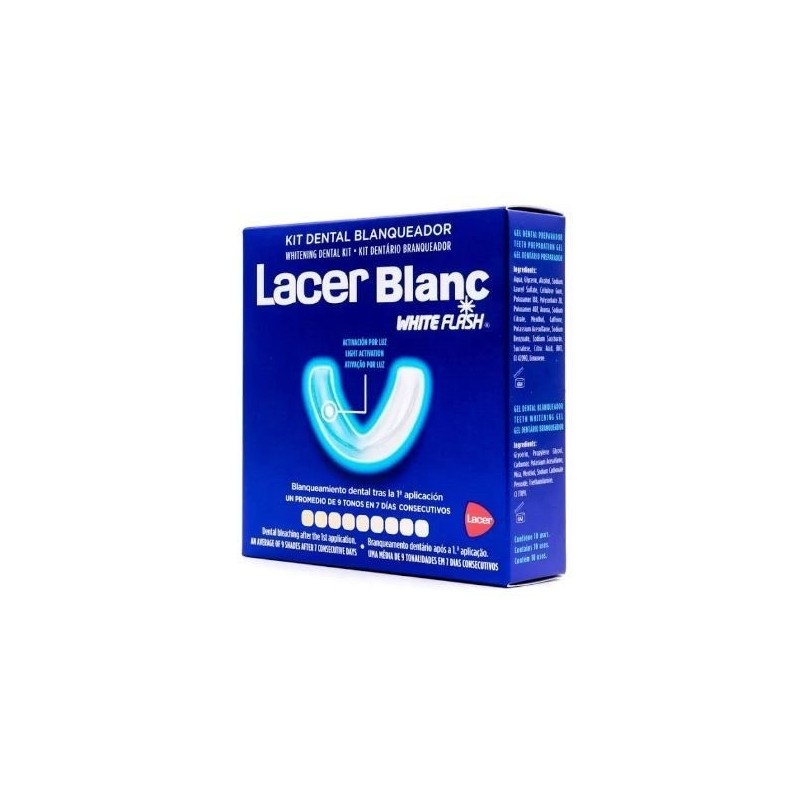 Férula dental fotoluminiscenteEl objetivo de la férula es mantener el gel dental blanqueador en contacto con el diente durante los 15 minutos que dura un uso del kit, contribuyendo a alcanzar la máxima eficacia del activo blanqueador.Pero, además, la férula dental de Lacer Blanc White Flash contiene pigmentos fotoluminiscentes que se cargan mediante la exposición a la luz solar o artificial en tan sólo 5 minutos. En la oscuridad tras cargarla, emite siempre luz. Incluso dentro de la boca sigue emitiendo la luz azul que contribuye a acelerar la reacción del activo blanqueador.Esta férula está fabricada con silicona. La silicona es un material cómodo y flexible en boca que se adapta a la mayoría de arcadas por lo que permite una comodidad en su uso excepcional. Gel dental preparadorEl gel dental preparador de Lacer Blanc White Flash ayuda a garantizar la eficacia en el blanqueamiento dental, ya que prepara el diente para la acción posterior del gel blanqueador.Se trata de un paso intermedio que se debe realizar justo después del cepillado dental y antes de aplicar la férula con el gel dental blanqueador. En su composición contiene:Un tensioactivo que ayuda a eliminar los residuos que hayan podido quedar en la superficie del diente y completar así la limpieza después del cepillado. Deja la superficie del diente en condiciones óptimas para recibir el activo blanqueador.Un alcaloide que contribuye a modificar el pH en el entorno del diente. Esto acelera la reacción del activo blanqueador que se produce cuando el gel blanqueador entra en contacto con el diente. Gel dental BlanqueadorEl gel dental blanqueador de Lacer Blanc White Flash contiene el activo blanqueador percarbonato sódico, una sustancia que bajo los efectos de la fotoluminiscencia de la férula y las condiciones creadas por el gel preparador, reacciona liberando peróxido de hidrógeno. El peróxido de hidrógeno actuará como radical libre contra las partículas pigmentadas que están incrustadas en el esmalte dental, rompiéndolas y descomponiéndolas en moléculas más pequeñas y solubles. De este modo, pueden ser arrastradas por el agua al enjuagar al finalizar un uso del kit, consiguiendo unos resultados deslumbrantes desde la primera aplicación.MODO DE USOAñadir el Gen Dental Blanqueador en la férula y aplicar durante 15 minutos.