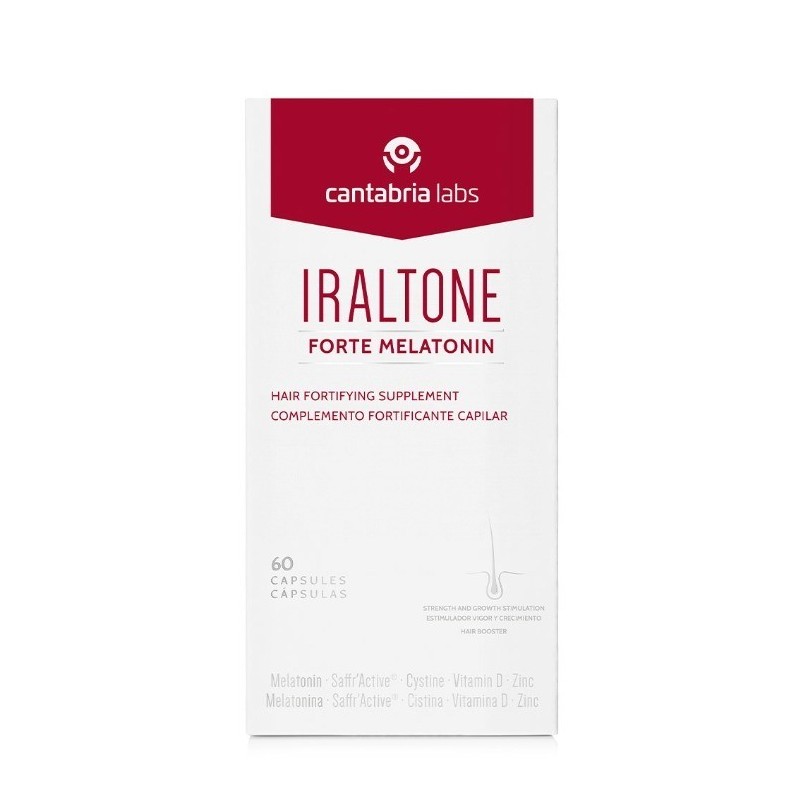 IRALTONE FORTE Melatonin proporciona una formula completa con vitaminas y oligoelementos tales como:– Vitamina B6 que participa en la síntesis normal de la cisteína (aminoácido constituyente de la queratina del pelo y de las uñas).– Zinc: Contribuye al mantenimiento del cabello en condiciones normales.– Cobre: contribuye a la pigmentación normal del cabello y a la protección de las células frente al daño oxidativo.– Melatonina: Contribuye a disminuir el tiempo necesario para conciliar el sueño.Complemento alimenticio con nutrientes que preservan el estado del cabello y uñas en condiciones normales y que permiten la conciliación del sueño, para disminuir los factores que afectan al crecimiento normal del cabello.Sin gluten.Sin lactosa.Sin maltodextrina.IndicaciónFuente concentrada de nutrientes que contribuyen a mantener el estado capilar en condiciones normales durante fases de caída estacional que perduran en el tiempo.ComposiciónCOMPLEJO CISTIONE (L-Cistina + Glutation)ZincCobreVitamina B6Vitamina DMelatoninaSaffr’Activ® TechnologyModo de empleoTomar una cápsula al día antes de dormir con un vaso de agua. No superar la dosis diaria expresamente recomendada.