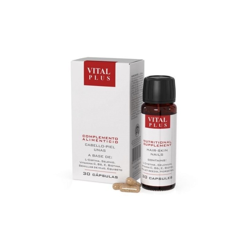 FUNCIÓN:COMPLEMENTO ALIMENTICIO MULTIVITAMÍNICO A BASE DE VITAMINAS A, E, C, B6, L-CISTINA, SELENIO, MIJO, BIOTINA Y NIACINA. PRINCIPIOS ACTIVOS MULTIFUNCIONALES Y ANTIOXIDANTES ESENCIALES PARA PROTEGER A LA PIEL Y AL CABELLO DE LOS PROCESOS DEGENERATIVOS Y DEL ENVEJECIMIENTO CUTÁNEO. LAS CÁPSULAS CONTIENEN LAS VITAMINAS MÁS IMPORTANTES DEL GRUPO B, QUE INTERVIENEN EN EL PROCESO DE CRECIMIENTO, CONSERVACIÓN Y REPRODUCCIÓN DEL CICLO PILOSO FISIOLÓGICO.ADEMÁS, EL EXTRACTO DE MIJO Y LA CISTINA TIENEN UNA ACCIÓN REESTRUCTURANTE INDISPENSABLE PARA LA BIOSÍNTESIS DE LA QUERATINA. LA PRESENCIA DE NIACINA Y BIOTINA SON EFICACES PARA NORMALIZAR Y PREVENIR LA DESCAMACIÓN CUTÁNEA, FACILITANDO LA NORMALIZACIÓN QUERATOLÍTICA.PRINCIPALES PRINCIPIOS ACTIVOS:L-CISTINA, SELENIO, VITAMINA C, B6, BIOTINA, NIACINA, EXTRACTO DE MIJO Y EXTRACTO DE EQUISETO.