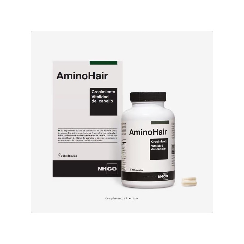 20 ingredientes activos se concentran en una fórmula única, incluyendo l-arginina, un extracto de eruca sativa que estimula el bulbo capilar favoreciendo el crecimiento del cabello, aminoácidos que constituyen las fibras de queratina y zinc que contribuye al mantenimiento del cabello normal. 1. Eruca sativa estimula el bulbo capilar promoviendo así el crecimiento del cabello. 2. El complejo cms-keratina y l-cisteína, aminoácidos que constituyen cada fibra proteica de la queratina. 3. Zinc ayuda a mantener el cabello en condiciones normales. 4. Cobre y vitamina e contribuyen a proteger las células frente al daño oxidativo. Además, el cobre contribuye a la pigmentación normal del cabello. El normal crecimiento, espesor y fuerza capilar dependen de la buena salud del folículo pilosebáceo, base de la parte viva del cabello. La caída de cabello, ocasional o continua, o un cuero cabelludo ralo o demasiado fino y quebradizo, son a menudo causados por una deficiencia nutricional. Aminohair concentra una fórmula de 20 ingredientes agrupados en 4 complejos que intervienen a diferentes niveles: complejo anap gh está compuesto por el aminoácido l-arginina, y rúcula (eruca sativa) que estimula el bulbo capilar promoviendo así el crecimiento del cabello**. Aminohair también es rico en nutrientes esenciales, incluyendo vitaminas b y hierro. Complejo cms-keratina y l-cisteína: aportan los aminoácidos que constituyen cada fibra proteica de la queratina para la densidad. Complejo 5α-lyso-zinc: contiene zinc que ayuda a mantener el cabello normal para su cuidado. Cobre y vitamina e: contribuyen a proteger las células contra el estrés oxidativo. El cobre contribuye también a la pigmentación normal del cabello. Este complejo promueve la luminosidad y la belleza del cabello.