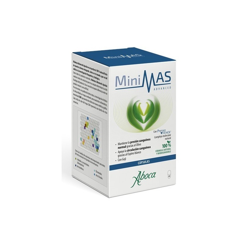 Minimas Advanced MANTIENE LA PRESIÓN SANGUÍNEA NORMAL GRACIAS AL OLIVO. APOYA LA CIRCULACIÓN SANGUÍNEA GRACIAS AL ESPINO BLANCO. CON GOJI. Minimas Advanced es un producto 100 % natural que nace de las avanzadas plataformas científicas de la investigación de Aboca, que han permitido desarrollar el innovador complejo molecular PressoFenol compuesto por fenoles, como procianidinas y flavonoides de Olivo, Espino blanco y Goji.Gracias al concentrado total de Olivo, Minimas Advanced mantiene la presión sanguínea normal, por lo que puede ser útil cuando se considere necesario (edad, tabaco, períodos de estrés, menopausia).Su formulación se completa con el concentrado total de Espino blanco, que apoya la circulación sanguínea, y el extracto de Goji.Natural y biodegradable al 100 %, Minimas advanced cápsulas no contiene sustancias de síntesis, semisíntesis o genéticamente modificadas.