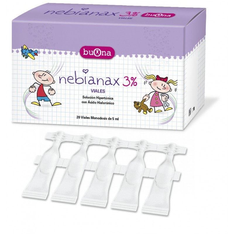 ACCIÓN DESCONGESTIONANTE DE LA MUCOSA NASAL, ASÍ COMO UN EFECTO FLUIDIFICANTE DE LA MUCOSIDAD.MARCADO CEORGANISMO NOTIFICADO Nº 0546CLASE IIANO ES ESTÉRIL.LACTANTES: APLICAR UNAS GOTAS EN CALLA FOSA NASAL, VARIAS VECES AL DÍA, POR TO GENERAL ANTES DE DAR EL PECHO O ANTES DE DORMIR.NIÑOS Y ADULTOS:1-3 LAVADOS POR FOSA NASAL, 2-3 VECES AL DÍA.SEPARAR UN VIAL MONODOSIS Y CALENTARLO ENTRE LAS MANOS ANTES DE SU ADMINISTRACIÓN. ABRIRLO GIRANDO LA TAPA.MANTENIENDO LA CABEZA DE LADO (NUNCA HACIA ATRÁS), INTRODUCIR DELICADAMENTE EN LA FOSA NASAL EL EXTREMO DEL VIAL Y PRESIONAR LIGERAMENTE.GIRAR LA CABEZA HACIA EL OTRO LADO Y REPETIR LA OPERACIÓN EN LA OTRA FOSA NASAL.EN EL CASO DE UTILIZACIÓN DE LA SOLUCIÓN PARA LA TERAPIA CON AEROSOL, SE RECOMIENDA SEGUIR LAS INSTRUCCIONES DEL APARATO.CLORURO DE SODIO, POTASIO FOSFATO BIBÁSICO, POTASIO FOSFATO MONOBÁSICO, AGUA.LA SOLUCIÓN NO ES INYECTABLE.NO UTILIZAR EN CASO DE HIPERSENSIBILIDAD CONOCIDA A ALGUNO DE SUS COMPONENTES.NO UTILIZAR EN CASO DE ENVASE DAÑADO.MANTENER LEJOS DEL ALCANCE DE LOS NIÑOS.EN NIÑOS MENORES DE 1 AÑO Y EN CASO DE TERAPIA FARMACOLÓGICA CONCOMITANTE CONSULTAR PREVIAMENTE AL MÉDICO.NO SE CONOCEN NI ESTÁN PREVISTOS EFECTOS COLATERALES RELACIONADOS CON EL USO DEL PRODUCTO.LAS PRUEBAS REALIZADAS EN EL PRODUCTO NO HAN PUESTO DE MANIFIESTO HASTA HOY FENÓMENOS DE SENSIBILIZACIÓN U OTROS EFECTOS COLATERALES.LAS SUSTANCIAS QUE CONTIENE NEBIANAX 3% TIENEN UNA SEGURIDAD COMPROBADA QUE PERMITEN SU USO INCLUSO REPETIDO.