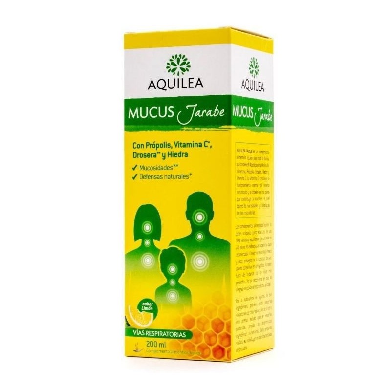 AQUILEA MUCUS JARABE:PARA UN NIVEL ÓPTIMO DE MUCOSIDAD.EL MOCO ES UNA SUBSTANCIA VISCOSA DE ORIGEN BIOLÓGICO QUE EN CONDICIONES NORMALES REPRESENTA LA PRIMERA BARRERA DE DEFENSA, PERO CUANDO POR ALGÚN PROCESO CATARRAL ESTA MUCOSIDAD SE VUELVE MÁS ABUNDANTE, MÁS DENSA Y MENOS ELÁSTICA, EN ESE MOMENTO APARECE LA CONGESTIÓN UNO DE LOS SÍNTOMAS MÁS CARACTERÍSTICOS DE ESTAS AFECCIONES RESPIRATORIAS.AQUILEA MUCUS JARABE, AYUDA A ALIVIAR LAS VÍAS RESPIRATORIAS DE LOS MÁS PEQUEÑOS Y DE TODA LA FAMILIA.ES UN COMPLEMENTO ALIMENTICO LÍQUIDO PARA TODA LA FAMILIA QUE CONTIENE N-ACETILCISTEÍNA, METILSULFONILMETANO (MSM), PRÓPOLIS, DROSERA, HIEDRA Y VITAMINA C. LA VITAMINA C CONTRIBUYE AL FUNCIONAMIENTO NORMAL DEL SISTEMA INMUNITARIO Y LA DROSERA ES UNA PLANTA QUE CONTRIBUYE A MANTENER EL NIVEL ÓPTIMO DE MUSCOSIDADES Y A LA SALUD DE LAS VÍAS RESPIRATORIAS.MODO DE EMPLEOADULTOS Y NIÑOS MAYORES DE 12 AÑOS: TOMAR UNA DOSIS DE 10ML, 2 VECES AL DÍA. NIÑOS ENTRE 6 Y 12 AÑOS: TOMAR UNA DOSIS DE 7ML, 2 VECES AL DÍA. NIÑOS ENTRE 3 Y 5 AÑOS: TOMAR UNA DOSIS DE 3ML, 2 VECES AL DÍA.AGITAR BIEN ANTES DE CONSUMIR.UNA VEZ ABIERTO, CONSERVAR EN EL FRIGORÍFICO.INGREDIENTES ACTIVOS POR 20ML: N-ACETILCISTEÍNA 295MG, MSM 100MG, PRÓPOLIS 50MG, EXTRACTO DE DROSERA 221,2MG, EXTRACTO DE HIEDRA 100MG, VITAMINA C 80MG (100% VRN*)*VALOR DE REFERENCIA DE NUTRIENTELOS COMPLEMENTOS ALIMENTICIOS NO DEBEN UTILIZARSE COMO SUSTITUTOS DE UNA DIETA VARIADA Y EQUILIBRADA Y DE UN MODO DE VIDA SANO. NO SE RECOMIENDA EN CASO DE ALERGIAS CONOCIDAS A PRODUCTOS APÍCOLAS. NO SOBREPASAR LA CANTIDAD DIARIA RECOMENDADA. CONSERVAR EN LUGAR FRESCO Y SECO, PROTEGIDO DE LA LUZ SOLAR. MANTENER FUERA DEL ALCANCE DE LOS NIÑOS MÁS PEQUEÑOS.