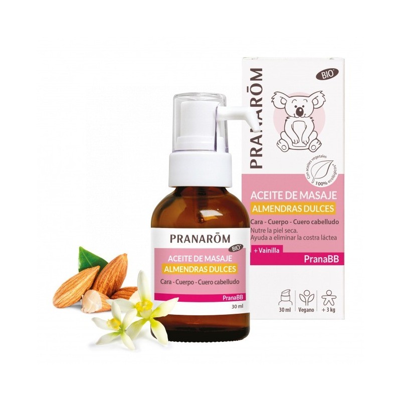 Nutre la piel seca. Ayuda a eliminar la costra láctea.El aceite de almendras dulces, rico en ácidos grasos insaturados, está indicado para la piel sensible del bebé. Es nutritivo y emoliente, por lo que suaviza la piel seca. Además, deja un delicado olor a vainilla y es perfecto para el masaje del bebé, verdadero momento de complicidad y relajación. Ideal para eliminar la costra láctea. Esencial para el cuidado diario del bebé.