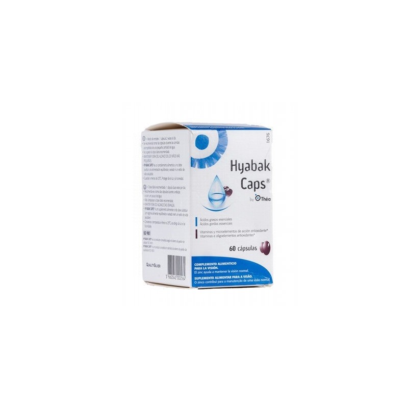 Complemento alimenticio que contiene Zinc ácidos grasos esenciales Omega 3 Omega 6 vitaminas y microelementos de acción antioxidante para mantener la visión normal.COMPOSICION por 2 capsulasÁcidos grasos esencialesAceite de pescado que contiene 70 % DHA (Omega 3) 560 mgAceite de borraja que contiene 22 % GLA (Omega 6) 420 mgVitaminasVitamina C 80 mg Vitamina E 10 mg Vitamina B6 2 mg Vitamina B9 200 µg Vitamina B12 1 µg Minerales Zinc 10 mg Zinc, vitamina E y vitamina C ayudan a proteger las células contra el estrés oxidativo. El zinc ayuda a mantener la vision normal.INGREDIENTESQUALITYSILVER® aceite de pescado (DHA 70 %), aceite de borraja (Borago officinalis) (GLA 22 %), gelatina (agente de recubrimiento), agua purificada, vitamina C (ácido ascórbico), glicerol (espesante), sorbitol (humectante), monostearato de glicerol (emulsionante), cera de abejas (antiaglomerante), aceite de soja (emulsionante), lecitina de soja (emulsionante), vitamina E (acetato de dl alfa-tocoferilo), zinc (óxido), vitamina B6 (clorhidrato de piridoxina), óxido de hierro negro (colorante), vitamina B12 (cianocobalamina 0,1 %), óxido de hierro rojo (colorante), vitamina B9 (ácido fólico)MODO DE EMPLEO1 cápsula 2 veces al día: Se recomienda tomar las cápsulas durante las comidas acompañada de una pequeña cantidad de agua.ADVERTENCIASHYABAK CAPS® es un complemento alimenticio y no debe sustituir una alimentación equilibrada y variada y un estilo de vida saludable. No superar la dosis diaria recomendada.INSTRUCCIONES DE CONSERVACIÓN - Mantener fuera del alcance de los niños pequeños. - Guardar a menos de 25°C. - Proteger de la luz y la humedad.