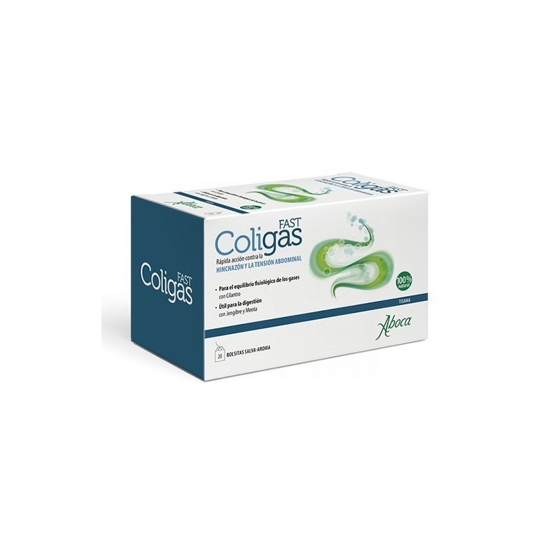 CXoligas tisanas favorece la rápida acción contra la hinchazón y la tensión abdominal, con cilantro para el equilibrio fisiológico de los gases en el tracto digestivo, con jengibre útil para la digestión. ColiGas Fast tisana puede ser útil en caso de hinchazón abdominal, a menudo asociada a tensiones molestas que pueden sentirse inmediatamente después de las comidas o durante el día.Modo de empleo:Se aconseja tomar una taza de tisana, incluso varias veces al dia. Para preparar la infusión, verter una taza de agua hirviendo (aproximadamente 200 ml) sobre el filtro y cubrirla para evitar que se dispersen las sustancias aromáticas más volátiles. Dejar en infusión durante algunos minutos. No es necesario añadir azúcar, dado que su formulación especial confiere un sabor agradable a la infusión, si es necesario, es preferible utilizar miel.
