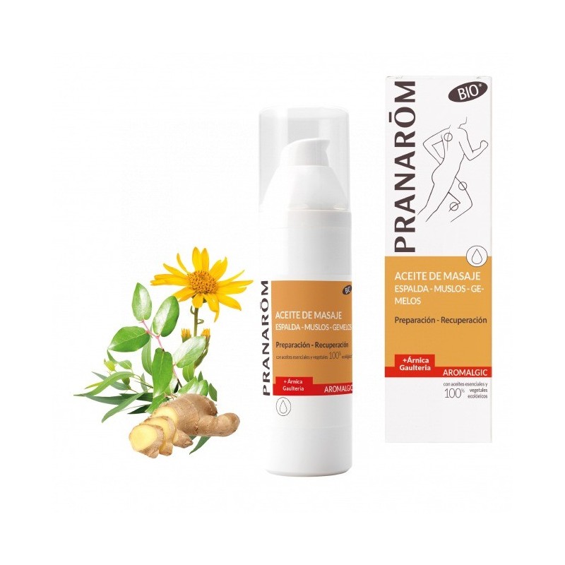 Aceite de masaje para espalda, muslos y GEMELOS, es ideal para masajes previos a esfuerzos físicos o masajes de estiramiento para una recuperación óptima. Con certificado ecológico* y formulado a base de aceites esenciales de gaulteria, eucalipto azul, jengibre, romero quimiotipo alcanfor y tomillo marroquí, además de extracto de árnica, para un masaje reconfortante.DosificaciónMasajear sobre las zonas corporales afectadas. Máximo 18 presiones del dosificador al día.ComposiciónCon aceites esenciales 100% ecológicos* : Eucalipto azul, Gaulteria olorosa, Jengibre, Romero QT Alcanfor, Tomillo marroquí.+ Aceite vegetale : Árnica*Ingrediente procedente de la Agricultura Ecológica (Control Certisys BE-BIO-01) - BIO Producto certificado conforme a los requisitos ECOGARANTIE® (Control Certisys).