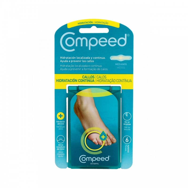 HIDRATACIÓN LOCALIZADA Y CONTINUA. PREVIENE Y TRATA LOS CALLOS. ALIVIA EL DOLOR DE LOS PUNTOS DE PRESIÓN Y SUAVIZA LA PIEL ENDURECIDA EVITANDO EVITANDO ASÍ LA FORMACIÓN DEL CALLO.MARCADO CE. ON: 0459. CLASE IIA, NO ESTÉRIL.1. LIMPIAR Y SECAR LA PIEL ANTES DE LA APLICACIÓN, ASEGURANDO QUE LA ZONA DEL CALLO ESTÉ LIMPIA DE RESTOS DE CREMAS Y ACEITES.2. RETIRAR EL PAPEL SUPERIOR Y DESPUÉS EL INFERIOR, EVITANDO TOCAR LA PARTE ADHESIVA.3. APLICAR EL APÓSITO FIRMEMENTE SOBRE EL CALLO, CON EL DISCO HIDRATANTE CENTRADO, ASEGURÁNDOSE DE QUE LOS BORDES NO FORMEN PLIEGUES.4. MANTENERLO EN SU SITIO HASTA QUE SE EMPIECE A DESPRENDER POR SÍ SOLO. EL APÓSITO PUEDE PERMANECER ADHERIDO VARIOS DÍAS5. PARA OBTENER MEJORES RESULTADOS, USAR HASTA QUE LA PIEL TRATADA SE HAYA SUAVIZADO Y CURADO. USAR CUANDO SEA NECESARIO PARA SUAVIZAR O PREVENIR LA ACUMULACIÓN DE PIEL ENDURECIDA QUE FORMA LOS CALLOS.CELLULOSE GUM, STYRENE-ISOPRENE COPOLYMER, PETROLEUM JELLY, HIDROCARBON RESIN, DIOCTYL ADIPATE, TITANIUM DIOXIDE, POLYURETHANE FILM.DIABÉTICOS: CONSULTAR A SU MÉDICO ANTES DE SU USO.NO APLICAR SOBRE HERIDAS INFECTADAS.PARA EVITAR INFECCIONES, NO DEBE REUTILIZARSE.NO DIVIDA NUNCA UN APÓSITO.LOS RESTOS DE ADHESIVO PUEDEN ELIMINARSE CON ALCOHOL LÍQUIDO, RESPETANDO LAS INSTRUCCIONES DE CUIDADO DEL TEJIDO.