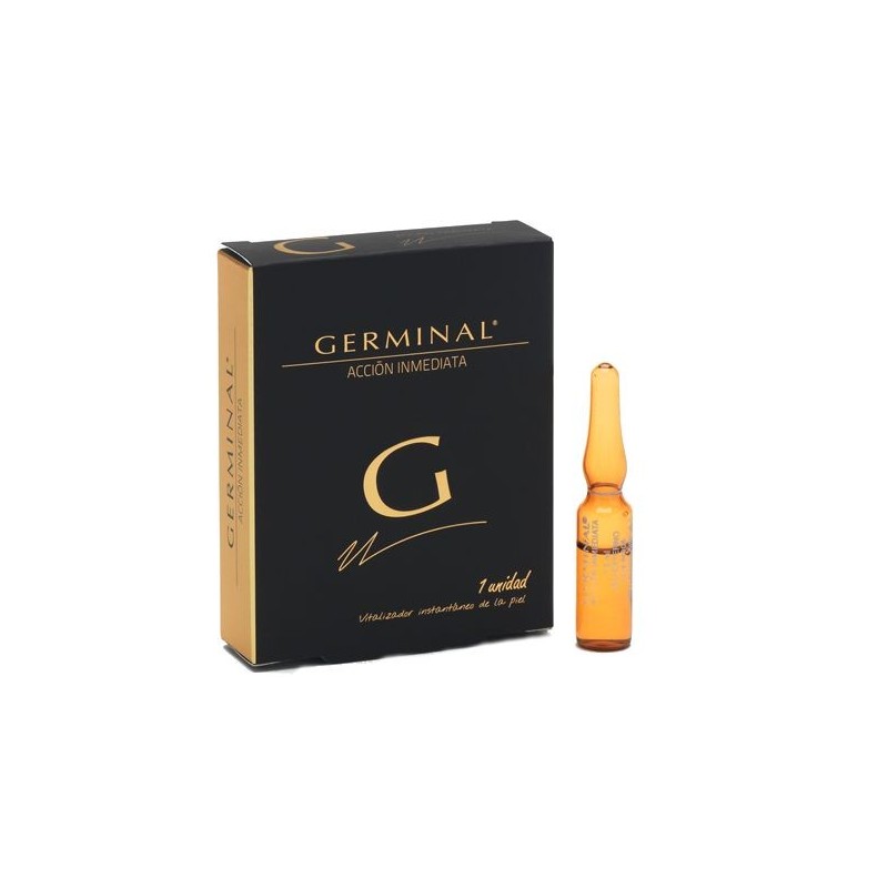 Germinal Acción Inmediata efecto flash instantáneo dejan la piel radiante durante al menos 8 horas. Germinal Acción Inmediata ampollas son un poderoso revitalizador de tejidos que consigue combatir las huellas de la fatiga en el rosto.Germinal Acción Inmediata tiene efecto tensor y nutritivo, hidratante, bioactivador del metabolismo celular, rico en taninos, aceites esenciales y síntesis del colágeno y la elastina.ConGerminal Acción Inmediata, impulsa tu belleza con tan solo un gesto.