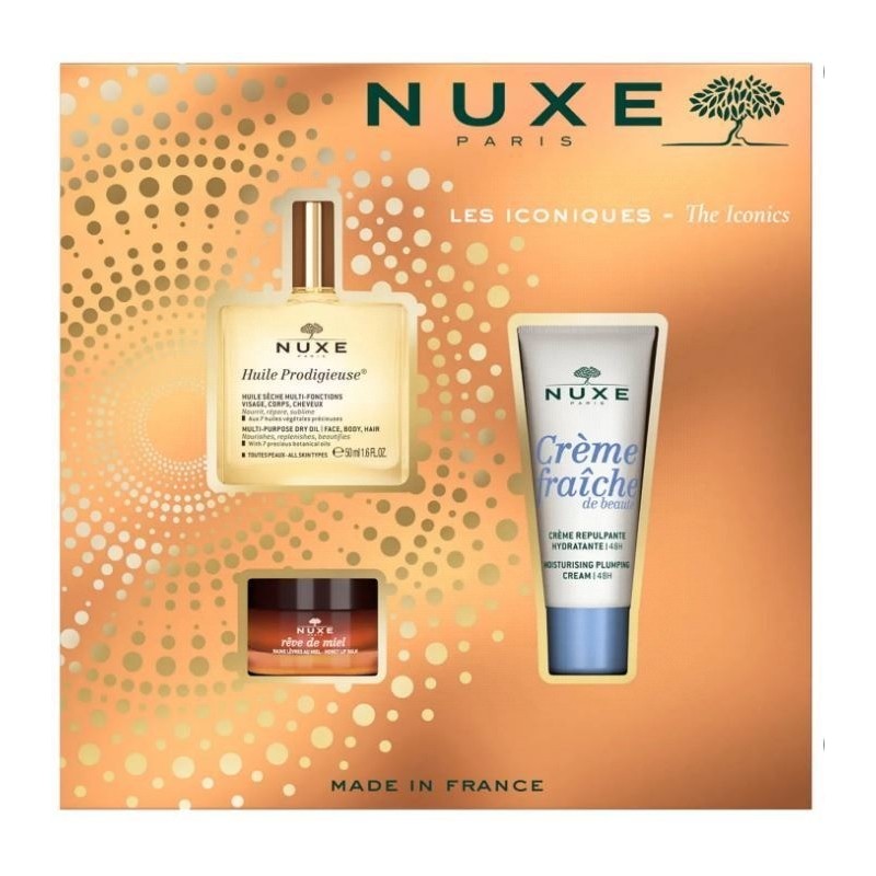 DESCUBRE LOS 3 TRATAMIENTOS ICÓNICOS DE NUXE PARA DESPERTAR TUS SENTIDOS. ESTE COFFRET TRATAMIENTO FACIAL CONTIENE:- HUILE PRODIGIEUSE® 50 ML- CRÈME FRAÎCHE DE BEAUTÉ® CREMA REDENSIFICANTE HIDRATANTE 48 H* 30 ML- RÊVE DE MIEL BÁLSAMO DE LABIOS CON MIEL ULTRA-NUTRITIVO Y REPARADOR 15 GTRATAMIENTOS FORMULADOS Y FABRICADOS EN FRANCIA.COFFRET FABRICADO EN FRANCIA, 100 % CARTÓN, 0 % PLÁSTICO Y RECICLABLE.*PRUEBA INSTRUMENTAL - 10 VOLUNTARIASDISFRUTA DEL SONIDO DE LA FELICIDAD CON TU PLAYLIST BY NUXE