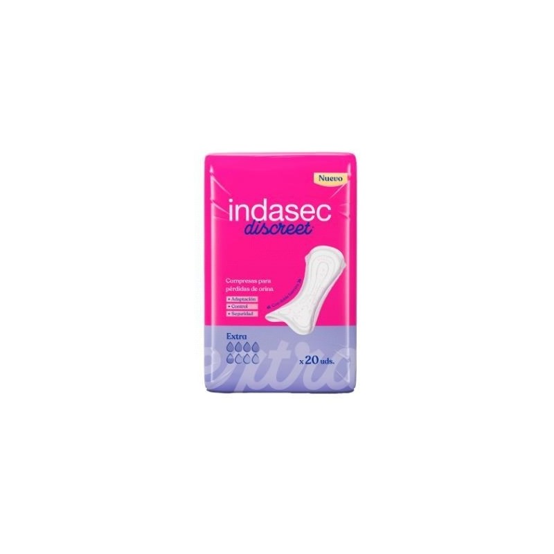 Indasec Discreet® Extra es la solución ideal para controlar pérdidas leves habituales. Se adapta perfectamente a la ropa interior y ofrece la seguridad necesaria para llevar una vida sin limitaciones.Esta compresa ofrece su máxima eficacia para garantizar la seguridad gracias a:Indasec Discreet® es una compresa ultrafina gracias a la exclusiva tecnología INNOVATHIN®. Un material absorbente de nueva generación, más concentrado que la celulosa, con una alta capacidad de absorción y retención, que permite obtener, uno de los dos núcleos de la compresa más fino.La innovadora Indasec Discreet® incorpora los NUEVOS CANALES de difusión, garantizando una rápida distribución del líquido a lo largo de toda la compresa, eliminando la sensación de humedad.Es la única compresa del mercado con DOBLE BARRERA antiescape, ofreciendo una mayor seguridad.Indasec Discreet® también incorpora la tecnología GelBlock®, gracias a la cual no solo neutraliza el olor, sino que además lo bloquea, destruyendo las bacterias que lo producen y evitando que ni siquiera llegue a aparecer.En el desarrollo de esta nueva compresa continuamos preocupándonos del cuidado de la piel de la zona íntima femenina. X3 Dermoprotección, una loción a base de 3 componentes naturales para una mayor protección para la piel. Una exclusiva emulsión de Grosella Negra, Aloe Vera y Extracto de Ambiaty.