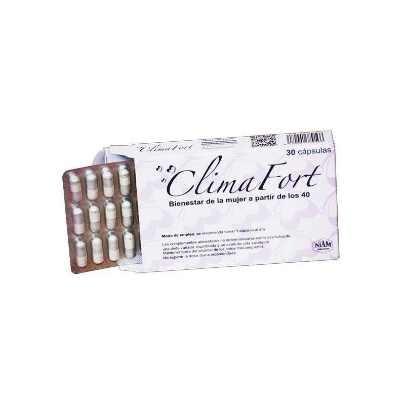 Indicado para aliviar los síntomas de la menopausia como sofocos, cambios de humor o insomnio, ClimaFort es eficaz en el 90% de las mujeres que lo probaron.ClimaFort es la alternativa natural al tratamiento hormonal ya que carece de efectos secundarios e incluye más de 10 vitaminas y minerales necesarios en esta etapa vital.Tras seis semanas tomando una sola cápsula al día, se notan mejoras físicas y psicológicas. Esto supone cambios en la calidad de vida y la garantía de estar utilizando un producto 100% natural sin hormonas ni isoflavonas de soja.