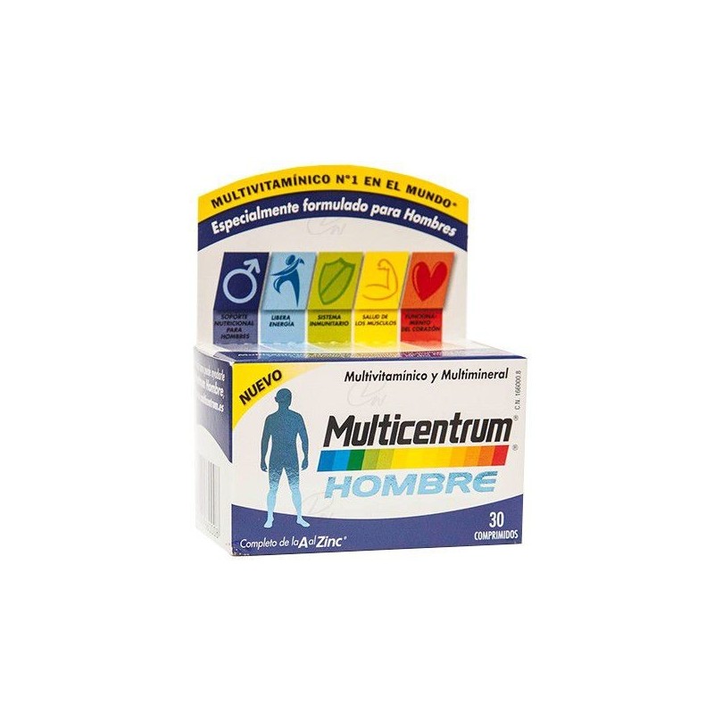 Complemento alimenticio a base de vitaminas y minerales, especialmente formulado para satisfacer las necesidades nutricionales de los hombres. MODO DE EMPLEO Tomar un comprimido al día. PRECAUCIONES Y ADVERTENCIAS Es importante mantener una dieta variada y equilibrada además de un estilo de vida saludable. Los complementos alimenticios no deben ser usados como sustitutos de una dieta equilibrada. Como medida de seguridad, el bote se encuentra sellado con una lámina de aluminio. No tome el producto si se encuentra dañada. En caso de sobredosis accidental, contacte inmediatamente con su médico o el Centro de Información Toxicológico. Si está tomando otros complementos, lea la composición dado que éstos pueden contener los mismos ingredientes. Después de cada uso, asegúrese de que el bote se encuentra cerrado y guardado dentro de su caja. Mantener fuera del alcance y de la vista de los niños. USO EN PACIENTES CON INTOLERANCIA ALIMENTARIA Este producto lo puede tomar una persona celíaca, alérgica/intolerante al huevo, alérgica a la proteína de leche o intolerante a la lactosa.COMPOSICIÓN POR UNIDADCALCIO 200 MILIGRAMOSCOBRE 0.5 MILIGRAMOSCROMO 40 MICROGRAMOSFOSFORO 105 MILIGRAMOSHIERRO 3.75 MILIGRAMOSMAGNESIO 120 MILIGRAMOSMANGANESO 2 MILIGRAMOSMOLIBDENO 50 MICROGRAMOSSELENIO 30 MICROGRAMOSVITAMINA A 800 MICROGRAMOSVITAMINA B1 1.8 MILIGRAMOSVITAMINA B12 3 MICROGRAMOSVITAMINA B2 2.1 MILIGRAMOSVITAMINA B3 20 MILIGRAMOSVITAMINA B5 7.5 MILIGRAMOSVITAMINA B6 2.1 MILIGRAMOSVITAMINA B8 62.5 MICROGRAMOSVITAMINA B9 200 MICROGRAMOSVITAMINA C 80 MILIGRAMOSVITAMINA D 10 MICROGRAMOSVITAMINA E 24 MILIGRAMOSVITAMINA K 30 MICROGRAMOSYODO 100 MICROGRAMOSZINC 5 MILIGRAMOSPeso neto: 39gr.Comercializado por GSK CH, Calle Severo Ochoa, 2, Tres Cantos, Madrid, 28760, España, 918070300