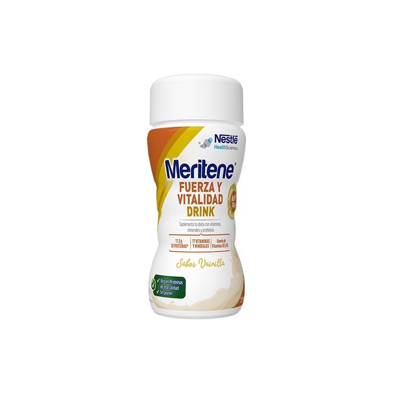 Meritene® FUERZA Y VITALIDAD es una solución nutricional en formato bebible listo para tomar. Su fórmula NutriPlus contiene proteínas, de alta calidad, vitaminas y minerales. Sus ingredientes permiten suplementar la dieta, contribuyen a disminuir el cansancio y la fatiga y al funcionamiento normal del sistema inmunitario. ¡Un PLUS en tu nutrición para DISFRUTAR al máximo cada día!