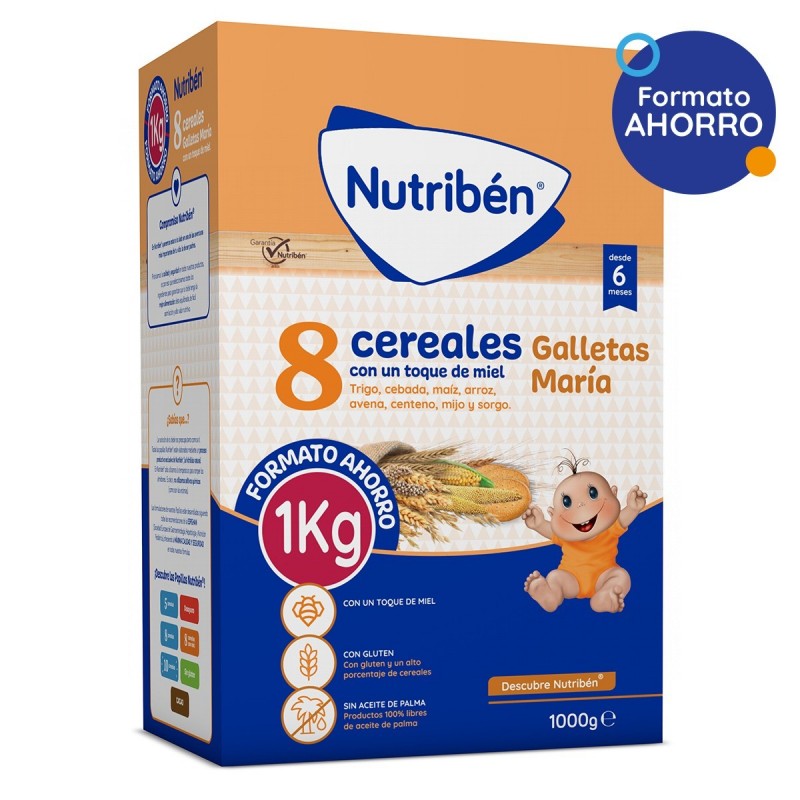 Esta papilla, en formato ahorro de 1 Kg, cuenta con una gran variedad de cereales, miel y galleta María, que le aporta un sabor delicioso y una textura suave. Es ideal para introducir nuevos sabores y con ella resolverás las dudas sobre cómo y cuándo dar galletas María a los bebés, ya que podrás ofrecer este alimento a partir de los 6 meses. Este formato supone un 10% de ahorro respecto al envase de 600 gr.Los bebés hasta los 3 años son especialmente vulnerables a las bacterias.Por eso, cuando el destinatario de la alimentación es un bebe, la seguridad y calidad de los alimentos es mucho más importante.¿Sabes qué es la normativa Seguridad Alimentaria?Es una normativa que aplica a la fabricación de los alimentos infantiles (0-3 años)Regula la presencia de residuos de plaguicidas y pesticidas. Prohíbe el uso de determinados plaguicidas muy tóxicos para los bebés.Exige el cumplimiento de medidas de higiene, uso de aditivos alimentarios, contaminantes y el uso de materiales que vayan a entrar en contacto con los productosDefine un nivel mínimo y máximo de todos los compuestos (energía, proteínas, carbohidratos, grasas, minerales, vitaminas y otros ingredientes), adaptados a las necesidades del bebé.Principales diferencias entre la Seguridad Alimentaria para bebés y en alimentación general:Los alimentos específicos para bebés cumplen con:Requisitos mayores de calidad y seguridad.Límites más estrictos de metales pesados, micotoxinas, contaminantes químicos, residuos de plaguicidas...Sin aditivos colorantes y sin edulcorantes permitidos.Gran cantidad de nutrientes en pequeñas porciones de comida.Los alimentos generales, no tienen tantas limitaciones, dado que el organismo adulto está más desarrollado y no se ve afectado de la misma manera.Todas las papillas Nutribén®, cuentan con la garantía de la normativa Seguridad Alimentaria, para alimentar a tu bebé de la forma más segura posible.Todos los productos Nutribén® están elaborados por un laboratorio farmacéutico.