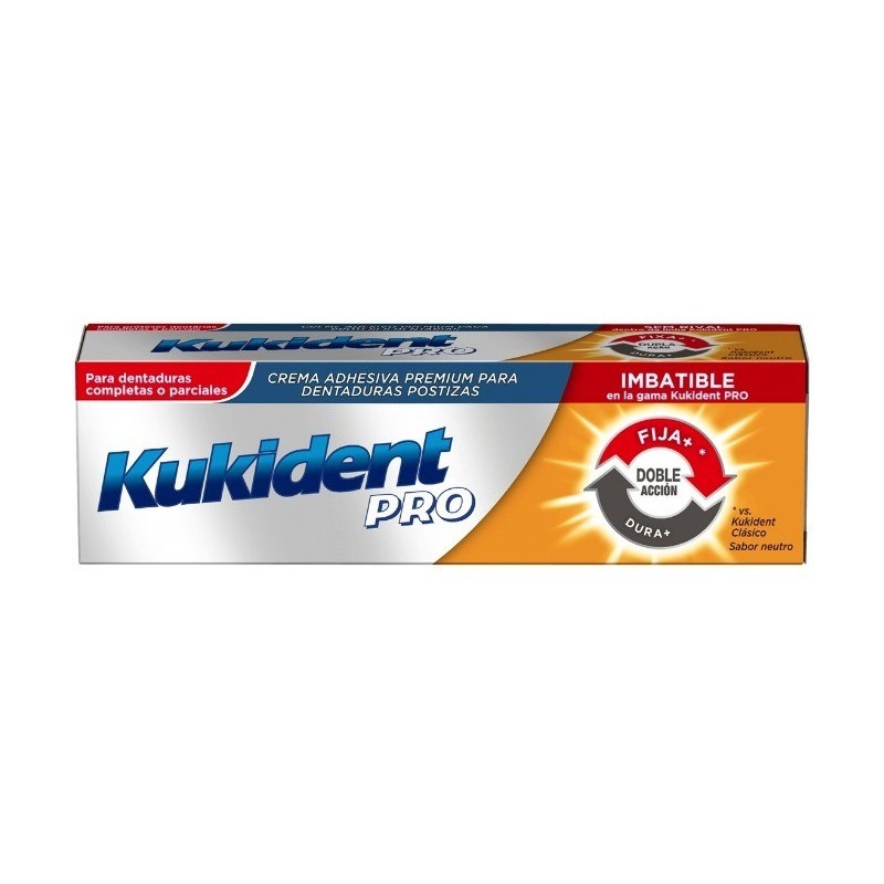 • El adhesivo premium para prótesis dentales Kukident Pro con sabor neutro ha sido especialmente diseñado para proporcionar la mejor fijación dentro de la gama Kukident.• Una fijación 10 veces más fuerte que en prótesis dentales sin adhesivo.• Para prótesis dentales completas o parciales.• FIJACIÓN INSUPERABLE dentro de la gama Kukident: hasta un 88 % de fijación al final del día.• Mayor fijación que Kukident Original: mantiene la prótesis en su sitio durante todo el día.• Mayor comodidad: amortigua entre las encías y la prótesis para un ajuste perfecto.