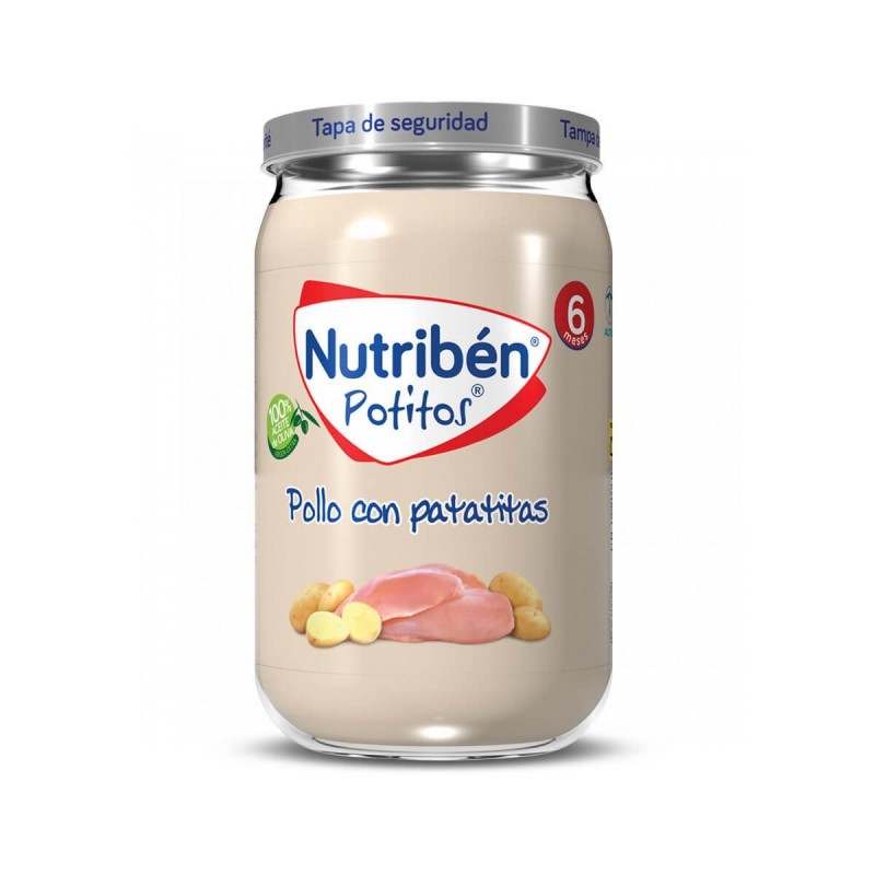 Información del producto / Regulación Nutribén Potitos® Pollo con patatas es un alimento infantil destinado a niños a partir del 6º mes de edad. Fabricado por Alter Farmacia S. A., Mateo Inurria, 30, 28036 Madrid (España). Nutribén Potitos® Pollo con patatas cumple con los estándares de composición establecidos por la FAO (ONU) en el Codex Alimentarius para preparados alimenticios complementarios para lactantes de más edad y niños pequeños, y es producido con los ingredientes y nutrientes abajo indicados. El producto cumple con el Reglamento 609/2013 relativo a los alimentos destinados a lactantes y niños de corta edad, los alimentos para usos médicos especiales y los sustitutivos de la dieta completa para el control de peso. Nutribén Potitos® Pollo con patatas cumple toda la legislación europea relativa a pesticidas, residuos, sustancias tóxicas y perjudiciales. Listado de ingredientes en orden decreciente Agua de cocción Pollo 15% Patatas 11% Arroz Almidón de maíz Aceite de oliva virgen extra 0,5% Cebolla Zumo de limón.Información nutricional Análisis medio por 100 g Valor energético 307 kJ 73 kcal Grasas 2,3 g de las cuales saturadas 0,7 g Hidratos de carbono 9,5 g de los cuales azúcares 0,4 g Fibra alimentaria 0,3 g Proteínas 3,4 g Sal 0,06 g Garantía de calidad Todo el proceso productivo está sometido a las “Prácticas higiénicas para la elaboración de alimentos infantiles y de niños de corta edad” de la Comisión del Codex Alimentario de la FAO/WHO CAC/RCP 21-1-1979. Además, el proceso productivo está certificado por las Normas ISO 9001e ISO 22.000. Método de elaboración del Potito El proceso se divide en las siguientes etapas: - Pesado y mezcla de materias primas - Cocción 100ºC durante 2 minutos - Llenado de tarros. - Esterilización (122ºC, 55 minutos) - Enfriado - Almacenamiento y cuarentena. - Análisis físico - químicos y microbiológicos - Etiquetado y embalaje Vida media del producto La calidad de este potito se garantiza durante los 3 años posteriores desde la fecha de producción siempre y cuando el almacenaje sea correcto. Conservación El envase se debe guardar en lugar fresco y seco. Una vez abierto el envase, se conserva 24 horas en el frigorífico.Instrucciones de preparación Abrir el potito y calentarlo al baño maría o al microondas sin tapa, removiendo posteriormente con una cuchara para conseguir una temperatura uniforme en todo el producto. Comprobar la temperatura antes de dársela al niño. No añadir sal o azúcar.