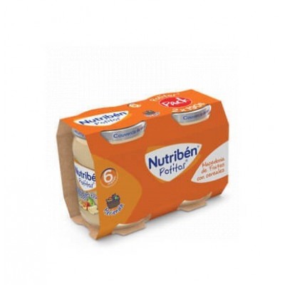 Un formato bipack con dos Potitos® de manzana, plátano, melocotón, zumo de naranja, albaricoque, pera, y cereales para bebés (maíz y arroz).