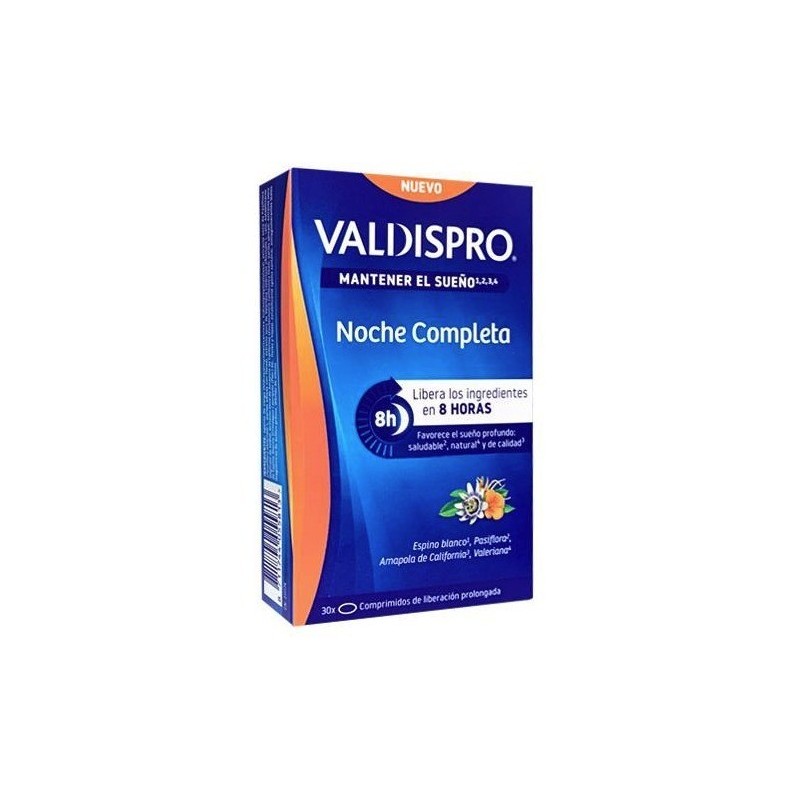 VALDISPRO NOCHE COMPLETA ES UN COMPLEMENTO ALIMENTICIO INDICADO PARA EL MANTENIMIENTO DEL SUEÑO DURANTE TODA LA NOCHE. GRACIAS A SUS COMPRIMIDOS DE LIBERACIÓN PROLONGADA, LOS INGREDIENTES SE LIBERAN DURANTE UN PERIODO DE 8 HORAS, AYUDANDO A DORMIR TODA LA NOCHE. CONTIENE UNA MEZCLA DE INGREDIENTES ESPECIALMENTE SELECCIONADOS PARA AYUDAR A DORMIR:EL ESPINO BLANCO REDUCE LA INQUIETUD Y AYUDA A DORMIR MEJORLA PASIFLORA MEJORA LA CALIDAD DEL SUEÑOLA VALERIANA AYUDA A MANTENER UN SUEÑO NATURALMODO DE EMPLEOTOMAR 1 COMPRIMIDO DE VALDISPRO NOCHE COMPLETA 30 MINUTOS ANTES DE ACOSTARSE.