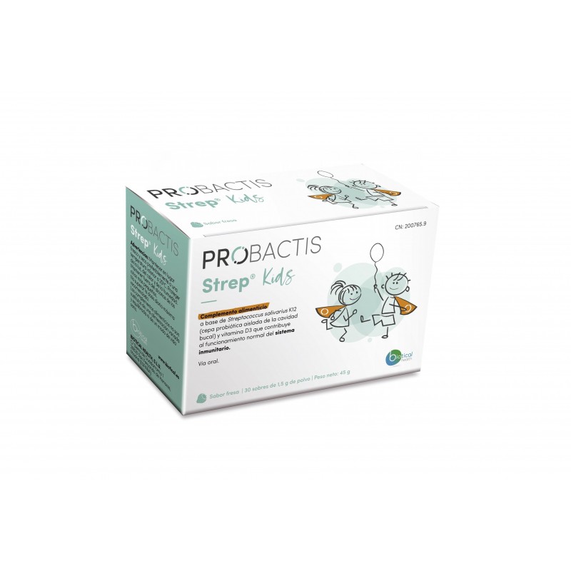 PROBACTIS STREP® ES UN PROBIÓTICO QUE CONTIENE STREPTOCOCCUS SALIVARIUS K12, LA CEPA PROBIÓTICA ORAL CON MÁS ESTUDIOS CLÍNICOS Y LITERATURA CIENTÍFICA PUBLICADA PARA LAS VÍAS RESPIRATORIAS ALTAS.SU FUNCIÓN ES FAVORECER UNA MICROBIOTA ORAL ADECUADA, REFORZAR LAS DEFENSAS Y LUCHAR CONTRA LAS INFECCIONES DE OÍDO Y GARGANTA.STREPTOCOCCUS SALIVARIUS K12 ES UN COLONIZADOR NATURAL DE LA BOCA Y LA ZONA RESPIRATORIA SUPERIOR EN LAS PRIMERAS SEMANAS DE VIDA A TRAVÉS DEL CONTACTO CON LA PIEL DEL PECHO MATERNO DURANTE LA LACTANCIA Y TAMBIÉN POR EL CONTACTO CON LA LECHE MATERNA.AUMENTA LAS DEFENSAS NATURALES DEL OÍDO, NARIZ Y GARGANTA COLONIZA DE FORMA EFECTIVA LA CAVIDAD ORAL FAVORECE UNA MICROBIOTA ORAL ADECUADA REFUERZA LA PRIMERA LÍNEA DE DEFENSA NATURAL DE ENTRADA DE MICROORGANISMOS CONTIENE VITAMINA D, QUE CONTRIBUYE AL FUNCIONAMIENTO NORMAL DEL SISTEMA INMUNITARIO