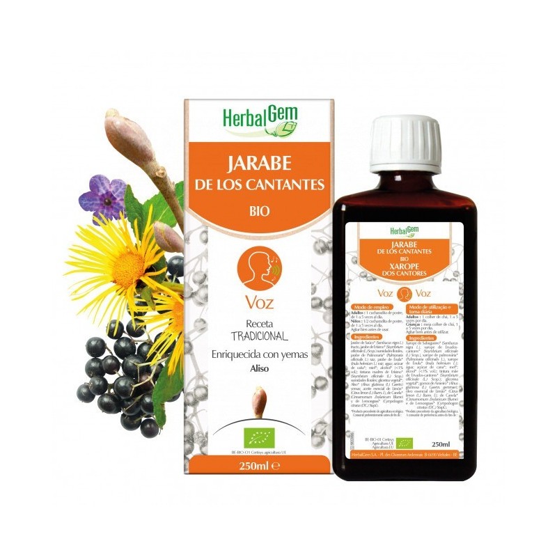 El JARABE de los CANTANTES está indicado para cuerdas vocales cansadas y en caso de afonía. El jarabe de erísimo, elaborado según una receta centenaria que ya utilizaban los cantantes del coro de la Capilla Sixtina de Roma en el siglo XVIII, actúa específicamente sobre las cuerdas vocales. El Sisymbrium officinale, más conocido como erísimo, contiene compuestos sulfurosos que suavizan las cuerdas vocales y ayudan a restablecer la voz. Este jarabe está indicado para todo aquel que utilice la voz con mucha asiduidad (cantantes, actores, profesores, conferenciantes, abogados, etc... ).DosificaciónAdultos : 1 cucharadita de postre, entre 1 y 5 veces al día. Niños : 1/2 cucharadita de postre, entre 1 y 5 veces al día.ComposiciónJarabe de saúco y de erísimo, aceite esencial de limón, yemas de aliso, azúcar de caña y miel*Ingrediente que procede de agricultura ecológica (Control Certisys-BE-BIO-01) - BIO significa : procedente de la agricultura ecológica (Control Certisys-BE-BIO-01).